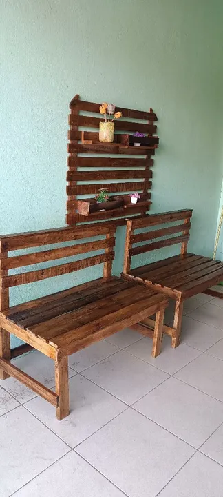 Banco de madeira rústico feito com pallets, ideal para áreas externas e internas. Ótimo para decorar sua casa ou jardim! Produto resistente e durável. Acompanha dois bancos.