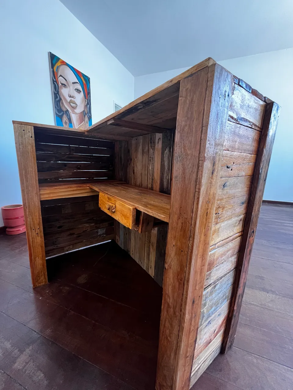 Balcão em madeira, com design rústico e acabamento artesanal, ideal para cozinhas, áreas gourmet, cafés, bares, ateliês ou espaços comerciais.
