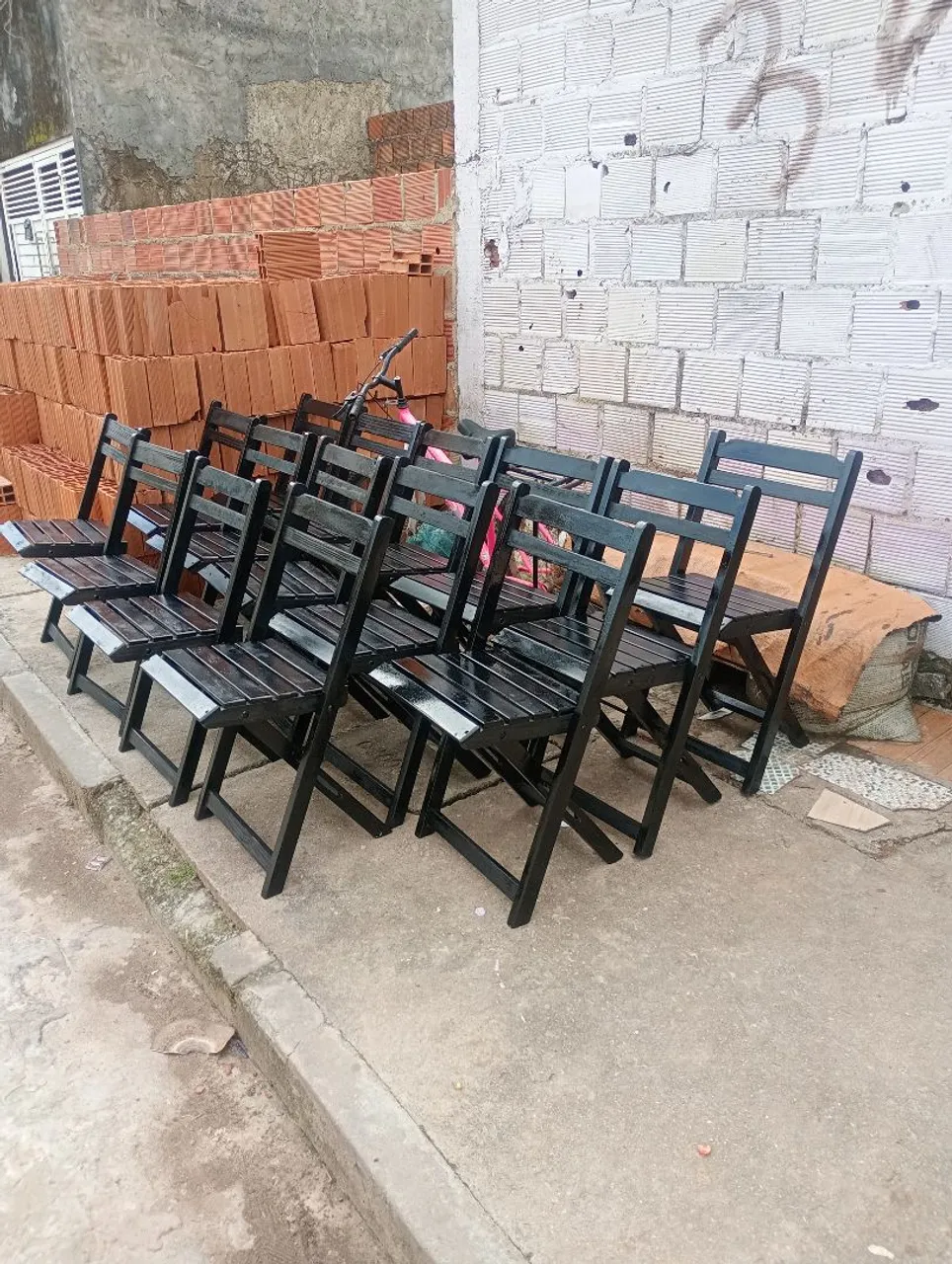 Conjunto de cadeiras de madeira dobráveis, perfeitas para diversos ambientes. Design elegante e funcional, ideal para otimizar espaços e proporcionar conforto.