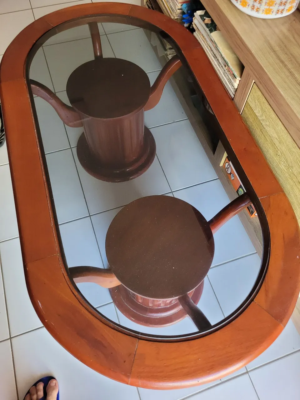Linda mesa de centro oval com design elegante e sofisticado. Possui tampo de vidro que valoriza o ambiente e base em madeira resistente.