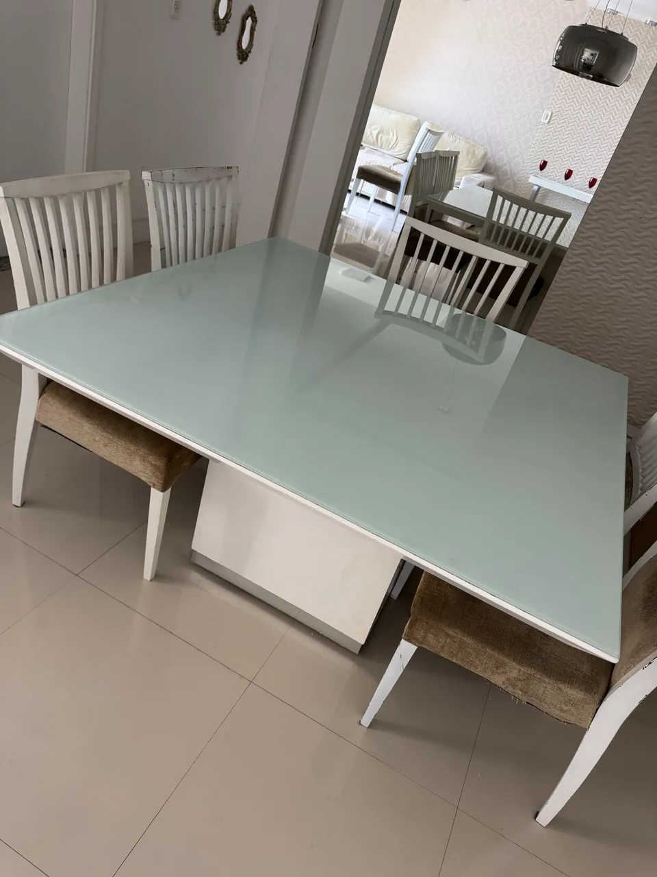 Linda mesa de jantar com design moderno, perfeita para reunir a família e amigos. Seu tampo de vidro confere elegância e sofisticação ao ambiente.