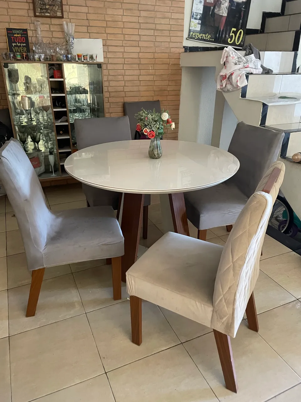Conjunto de mesa redonda com 4 cadeiras, perfeito para sua sala de jantar! Design moderno e elegante, ideal para reunir a família e amigos. Garanta já o seu!