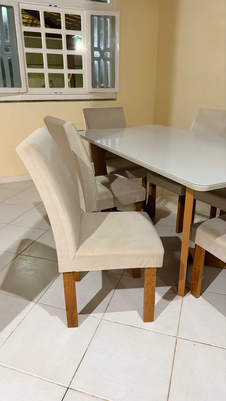 Conjunto de mesa com 6 cadeiras e tampo de vidro, com pouco tempo de uso! Perfeito para sua sala de jantar! Design elegante e confortável para momentos especiais.
