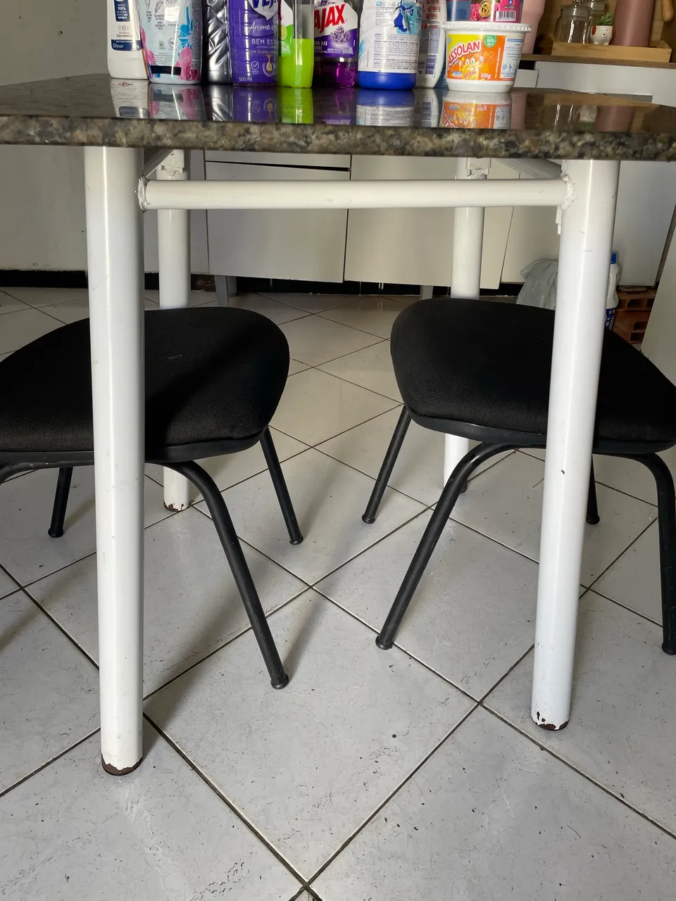 Linda mesa com tampo de mármore e 4 cadeiras. Perfeita para sua cozinha ou sala de jantar, combinando elegância e funcionalidade. Garanta já a sua!