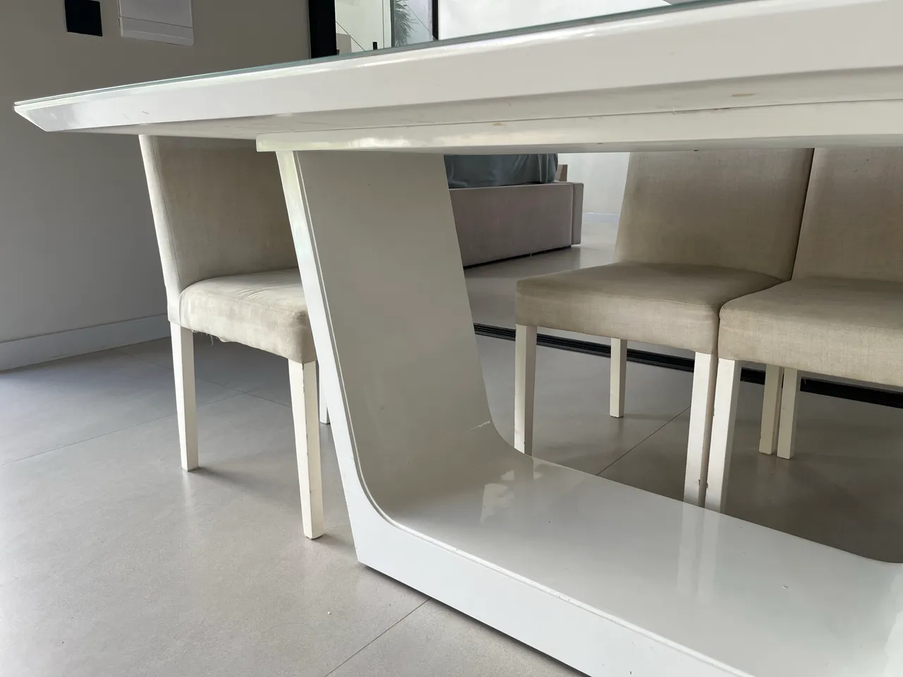 Linda mesa de jantar com design moderno, laqueada na cor branca, tampo de vidro medindo 1,80 x 1,00 m e cadeiras com estofados em linho. Perfeita para reunir a família e amigos em momentos especiais.