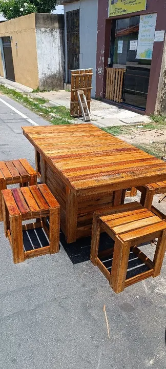 Mesa de Jantar rústica e moderna feita com madeira de pallet. Ideal para quem busca um estilo único e sustentável. A mesa possui 6 bancos e é perfeita para receber amigos e familiares.