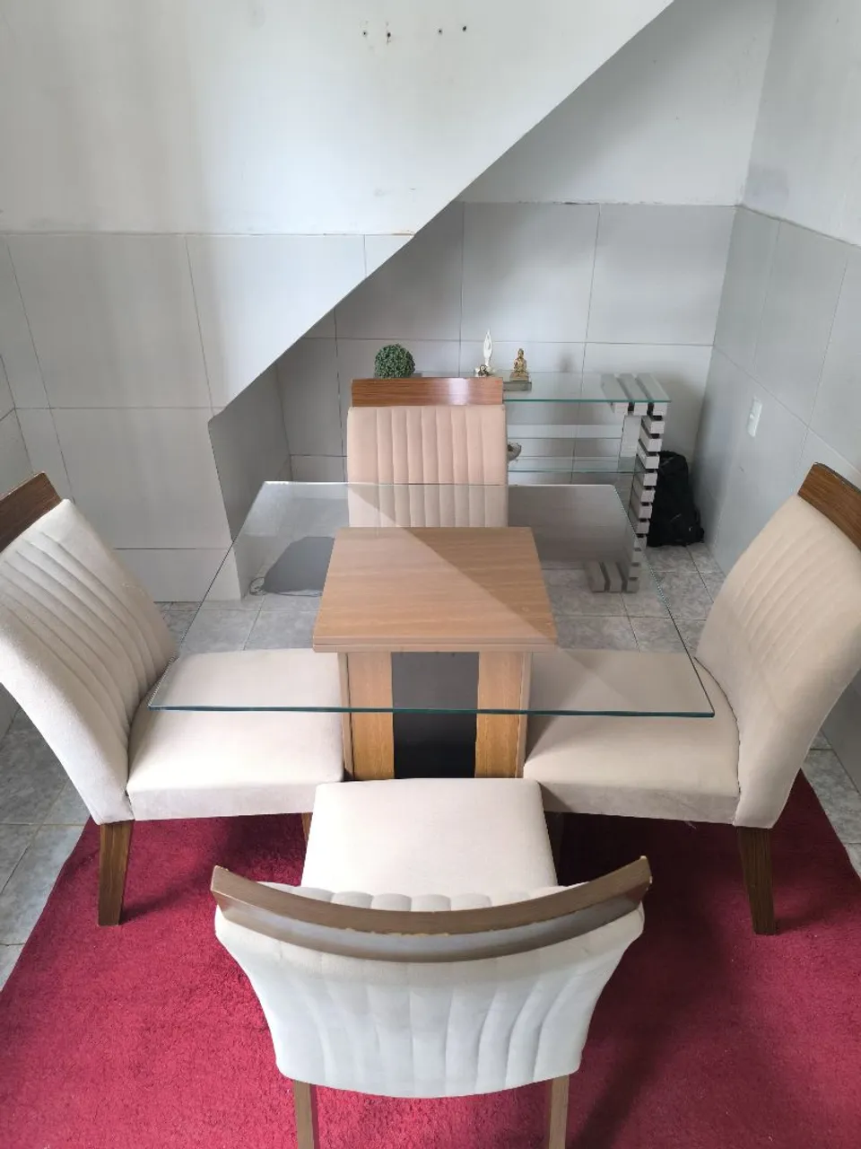 Linda mesa com tampo de vidro e 4 cadeiras, perfeita para sua sala de jantar. Design elegante e moderno que combina com qualquer ambiente. Ideal para reunir a família e amigos em momentos especiais.