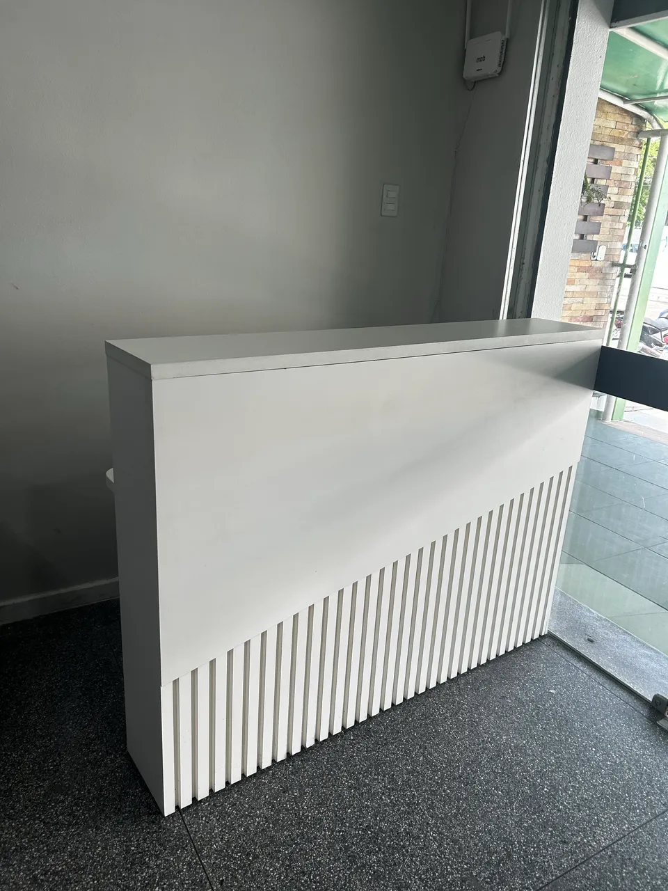Linda bancada de recepção em MDF branco, perfeita para dar um toque moderno e elegante ao seu espaço. Design clean e funcional, ideal para otimizar o ambiente da sua recepção.