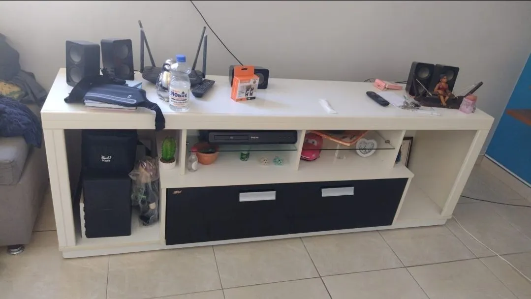 Apresentamos este rack em ótimo estado, ideal para organizar sua sala com elegância e praticidade. Design moderno e funcional, perfeito para acomodar sua TV e outros aparelhos eletrônicos.