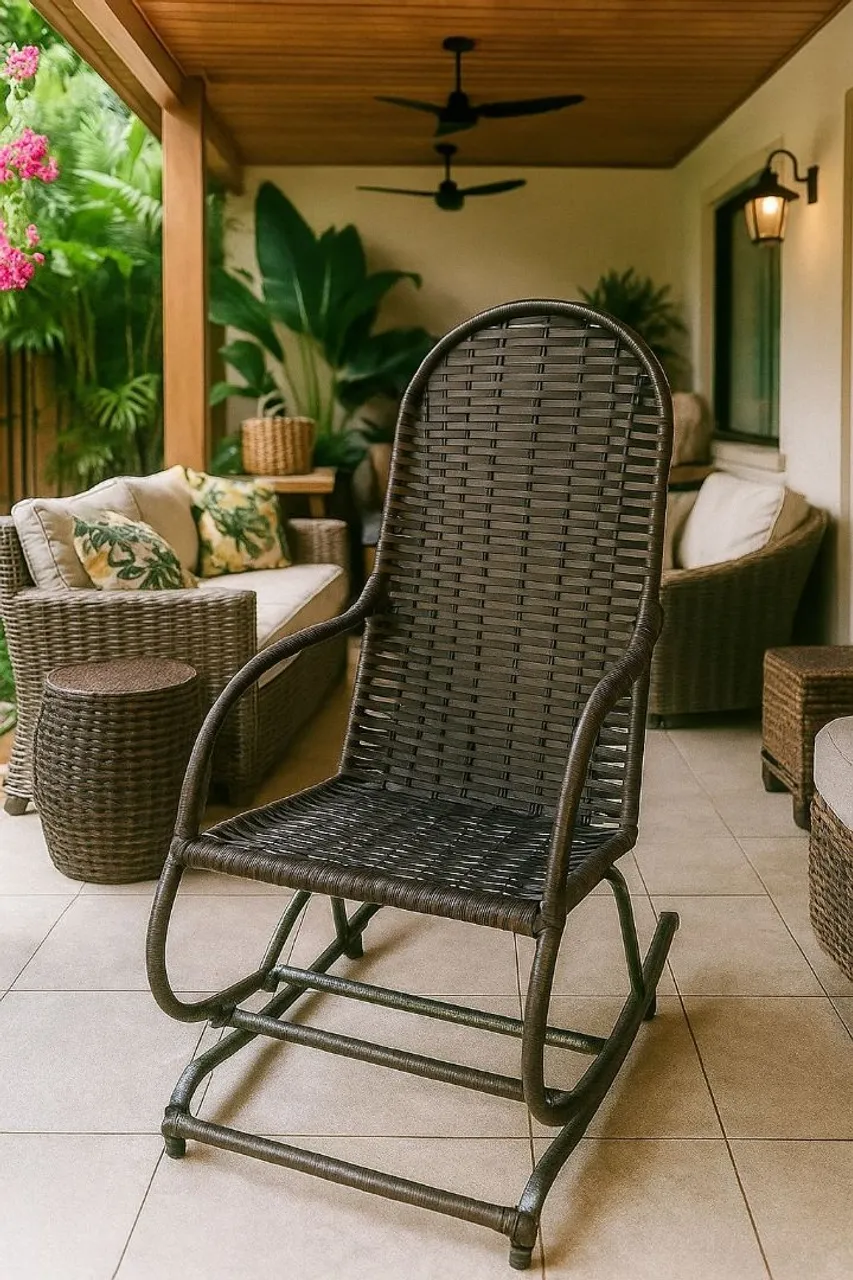 Desfrute do conforto e elegância com esta cadeira de balanço em fibra sintética. Perfeita para relaxar em sua varanda ou área de lazer, combinando design moderno e durabilidade.