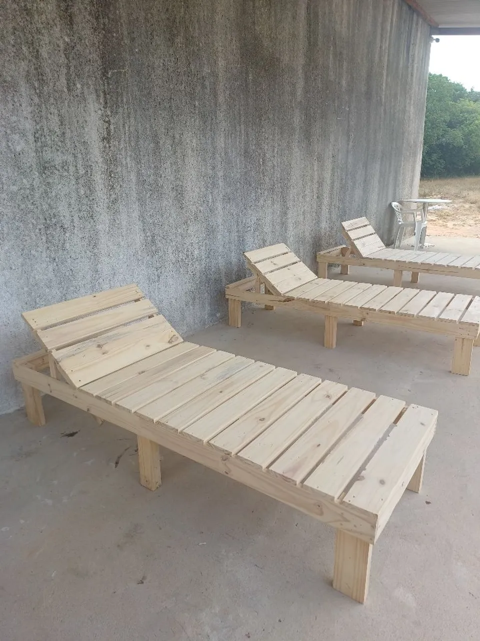 Confortáveis macas e cadeiras de madeira de pallet de pinus para relaxar. Design rústico e resistente, ideal para áreas externas.