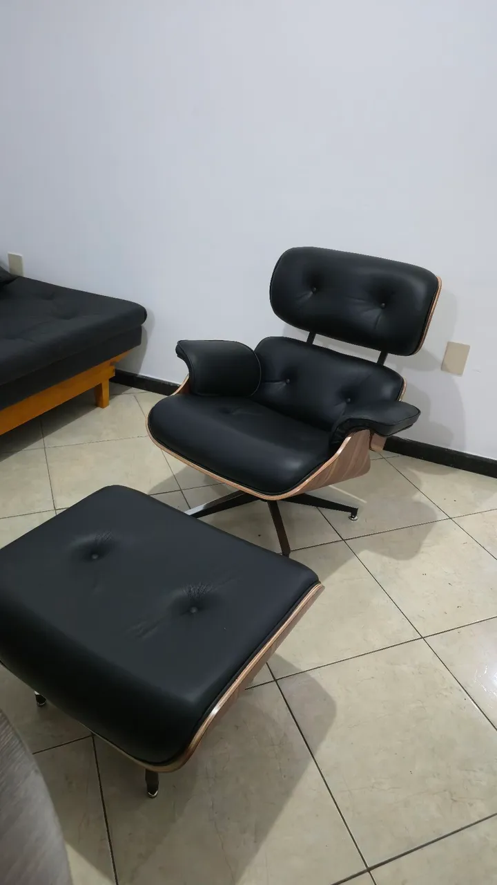 Conjunto de poltrona e puff Eames, design clássico e elegante para sua sala. Conforto e estilo em um só produto.
