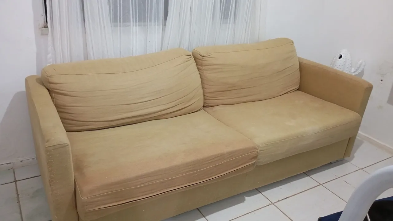 Sofá confortável e espaçoso, perfeito para relaxar e aproveitar momento, e bem fofinho, tem algumas manchas, porém acredito que saia com lavagem a seco, pra vender o mais rápido possível.