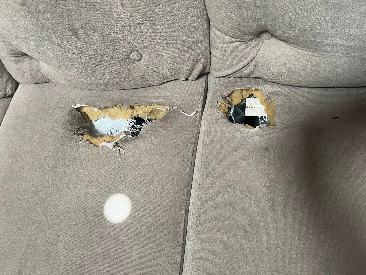 Sofa com furo, bom pra reformar ou ate mesmo colocar um pedaco de espuma e cubrir