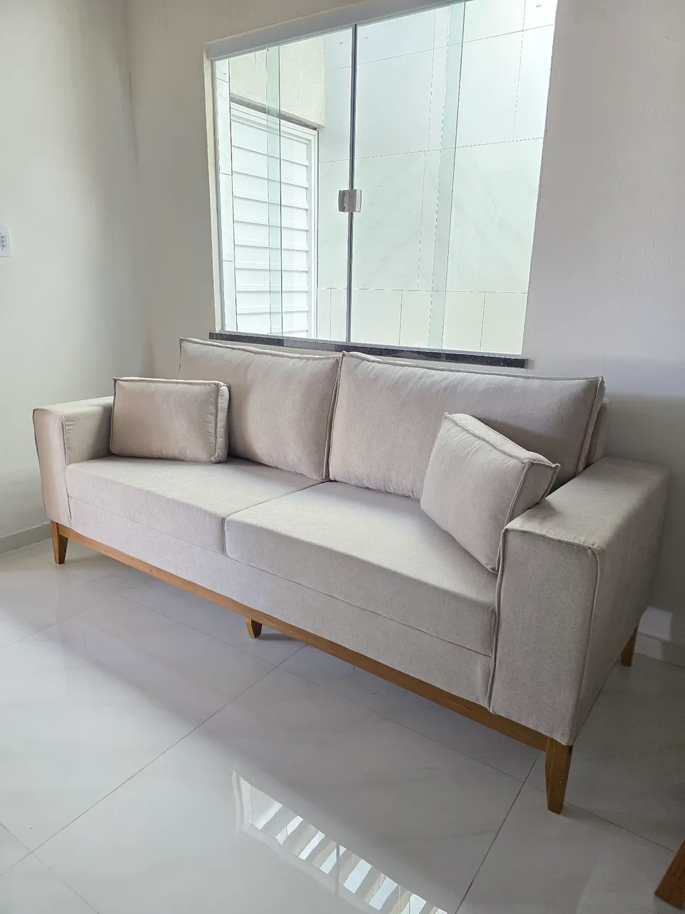 Sofá elegante e confortável, perfeito para sua sala. Design moderno com almofadas inclusas, ideal para relaxar e receber. Estrutura resistente e acabamento impecável.