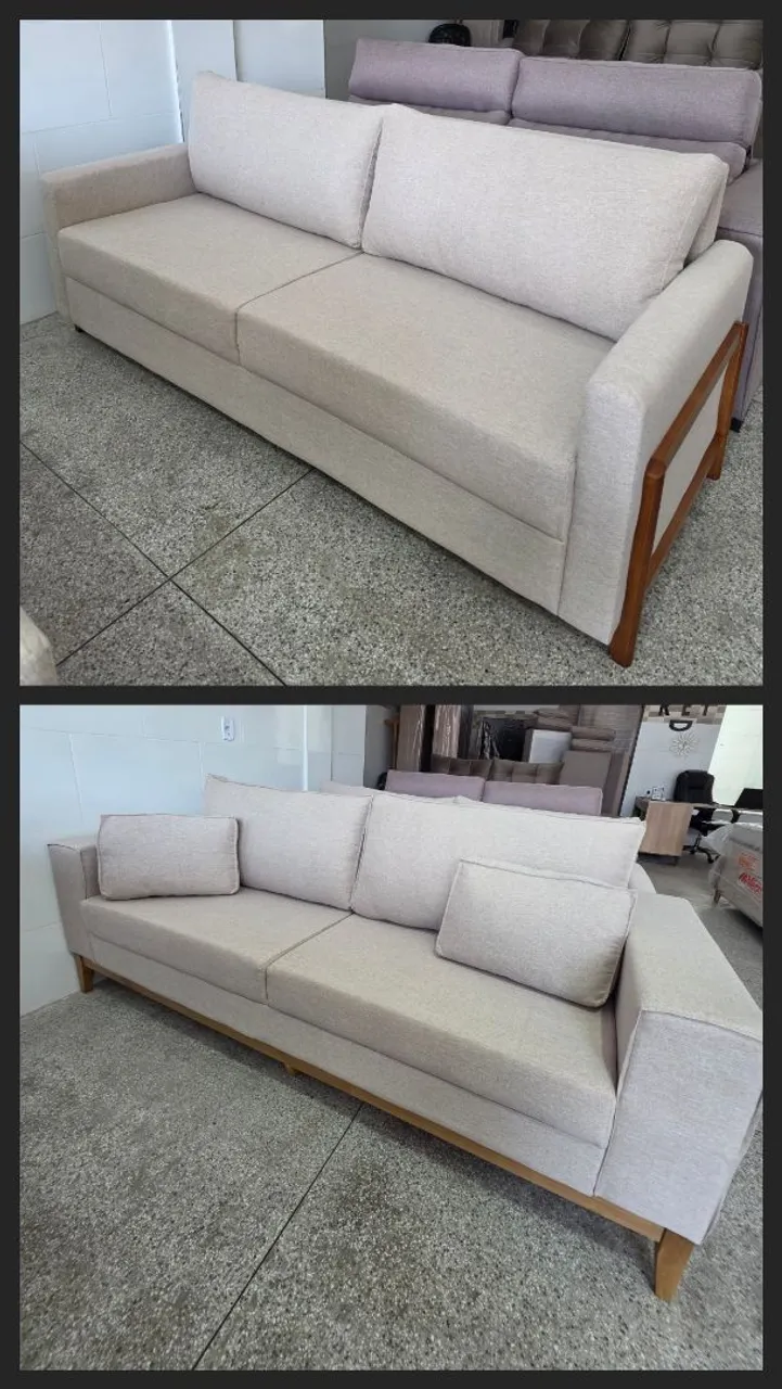 Sofá elegante e espaçoso, perfeito para sua sala! Design moderno e almofadas macias, ideal para relaxar e receber amigos. Detalhes em madeira que agregam charme.