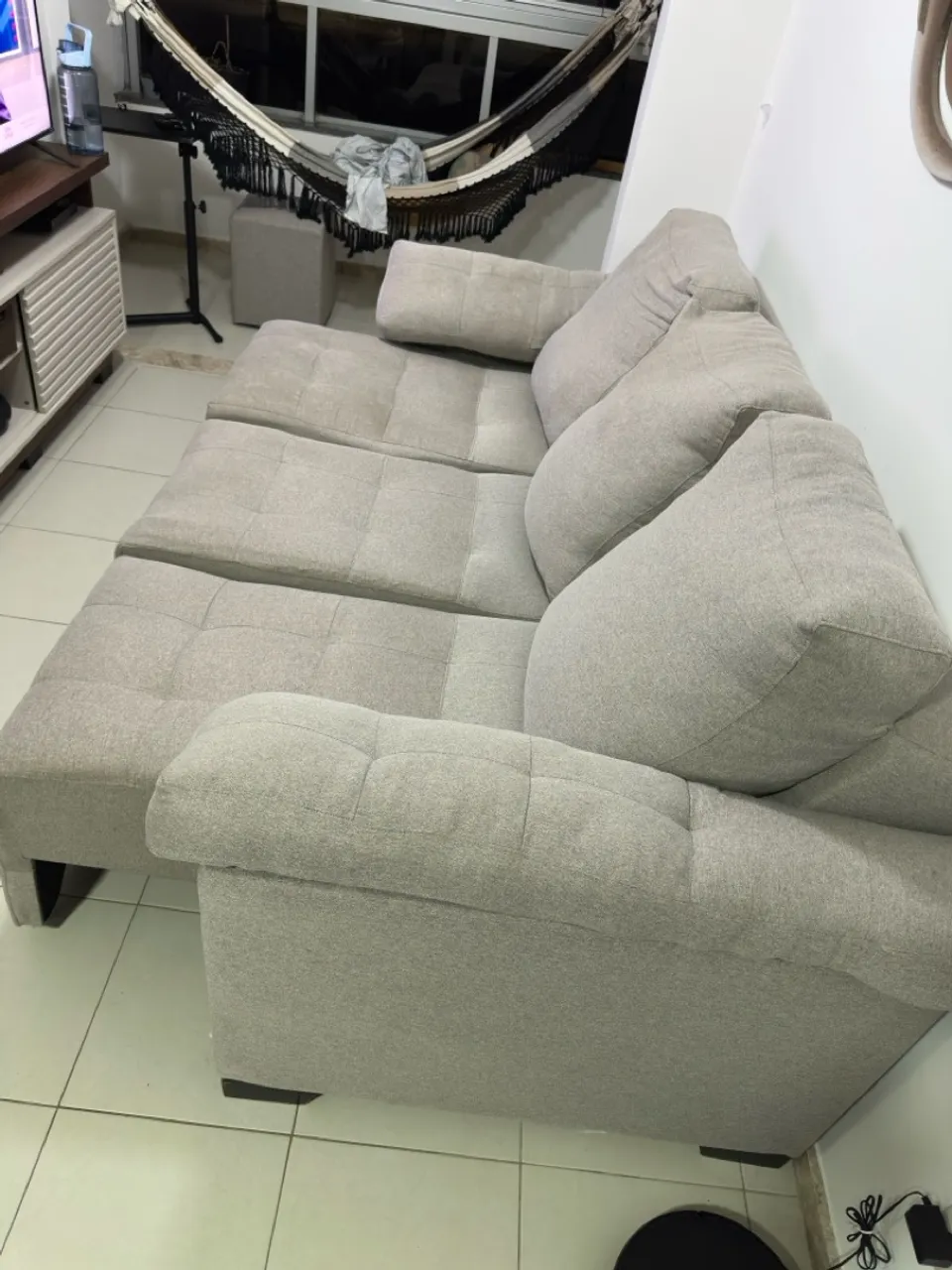 Vendo sofá retrátil de linho cinza, com design moderno e sofisticado, perfeito para quem valoriza conforto e beleza. Ideal para: