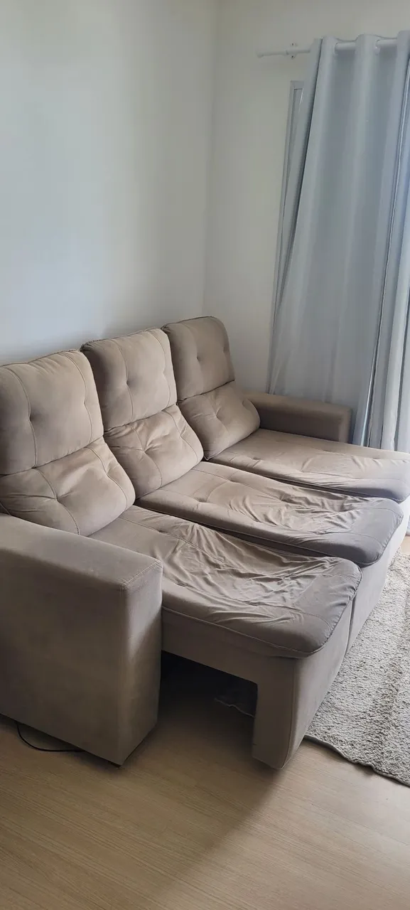 Sofá retrátil com 2 metros de 30 cm de comprimento. Muito grande! Precisa repor as espumas de dois lugares. Possui entrada USB para carregar aparelhos direto no Sofá. Ele é bem grande, precisa desmontar para transportar.
