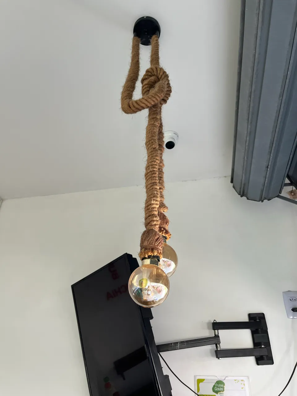 Luminária pendente com design rústico e elegante, luz quente.