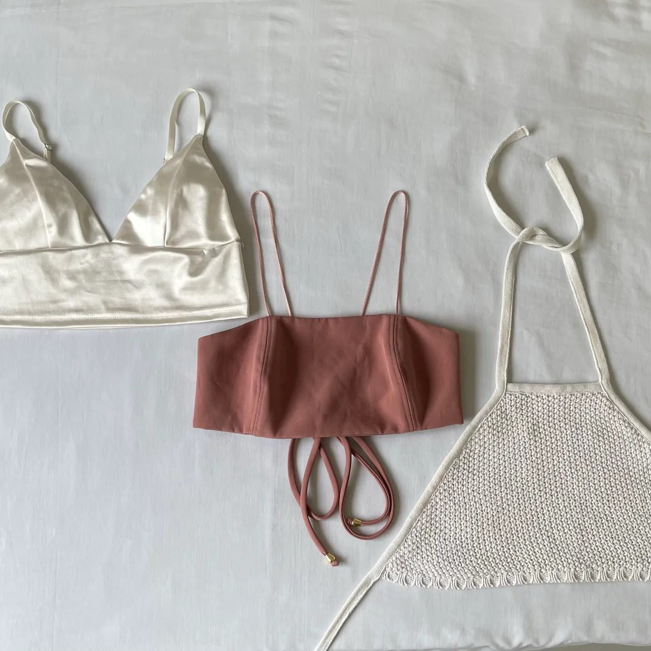 Renove seu guarda-roupa! Kit com 3 croppeds imperdíveis: 1 frente única em tricô off-white, 1 estilo top em cetim pérola e 1 rose com amarração e ponteiras douradas. Peças perfeitas para compor looks. Vestem tamanho P. Para mais informações, fale comigo pelo chat!