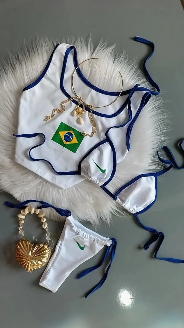 Biquíni branco com detalhes em azul, perfeito para você arrasar na praia ou piscina. Design moderno e confortável que valoriza suas curvas.