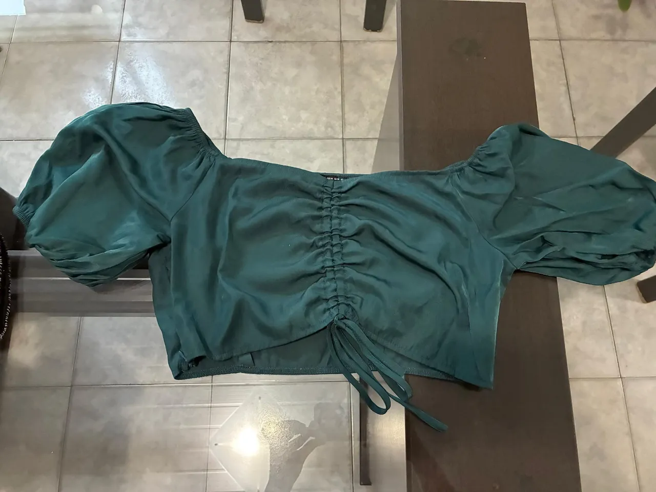 Lindo cropped verde com detalhe franzido, acompanhado de cordão regulador e mangas bufantes, decote ombro a ombro e zíper discreto na lateral. Usados poucas vezes, ótimo estado de conservação. Veste do P ao M