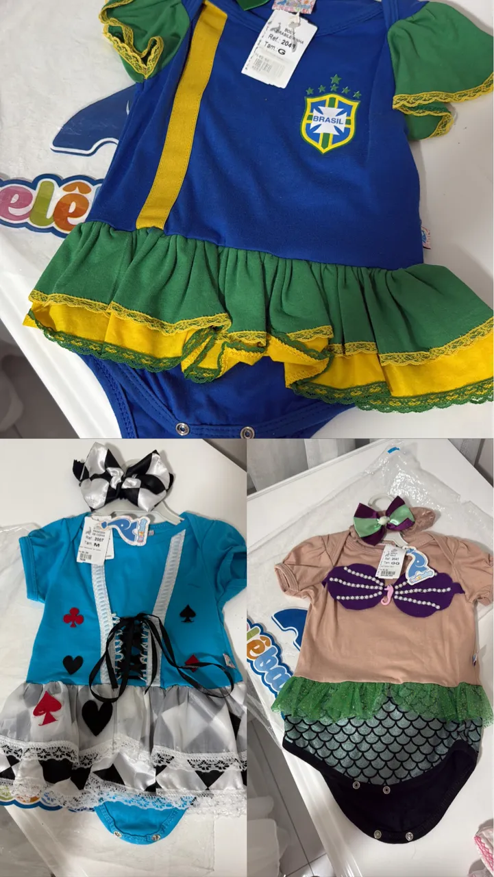 Fantasia nova de Alice no país das maravilhas Tamanho M Fantasia nova da seleção brasileira Tamanho G Fantasia nova da pequena sereia Tamanho GG