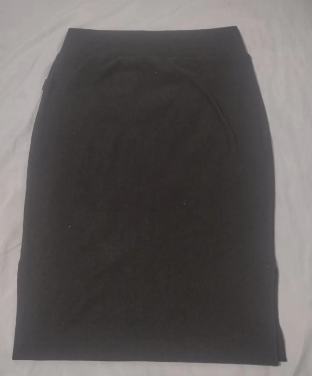 A saia vai até o joelho e possui duas fendas pequenas em cada lateral, o material dela estica. Nunca foi usada, está nova