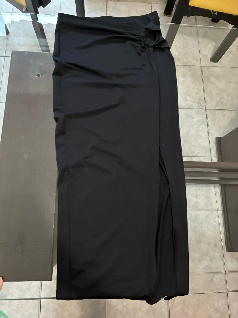 Linda saia longa preta, com detalhe drapeado na cintura e fenda lateral que valoriza a silhueta. Ótima para montar diversos looks! Tecido em malha, veste do P ao M. Usada apenas 2 vezes, ótimo estado de conservação. Fica linda no corpo!