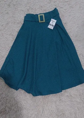 Saia verde social com cinto tamanho P, saia em renda rosê tamanho M e saia de poá preto com.branco tamanho unico.