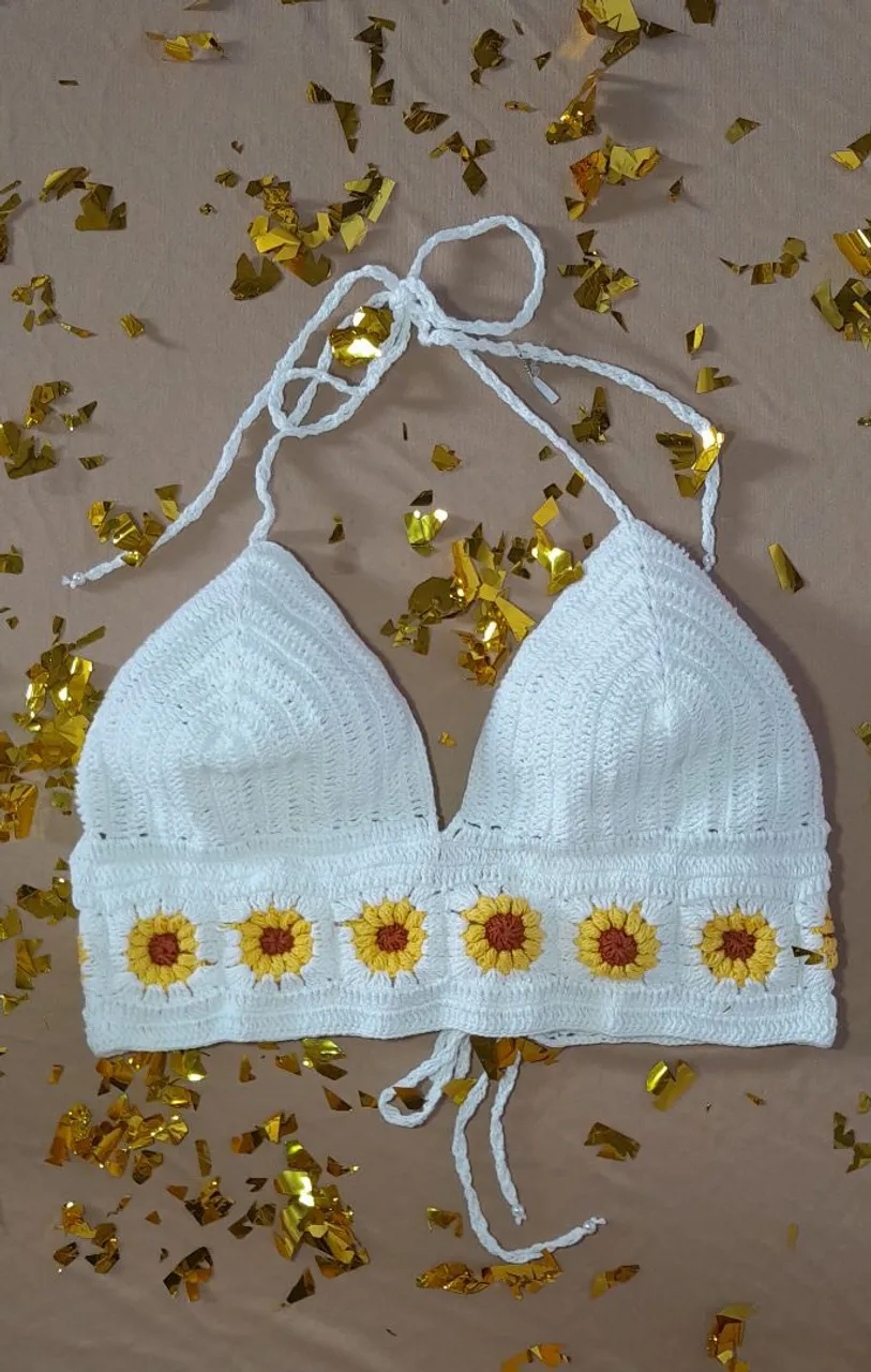 Lindo top de crochê, perfeito para um visual charmoso e estiloso. Feito com fio de alta qualidade e detalhes vibrantes, este top é a peça ideal para você se destacar.