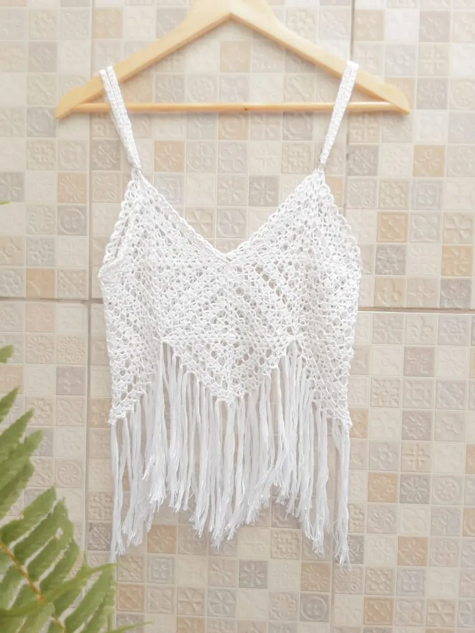 Lindo top de crochê branco com detalhes em franjas, perfeito para um look moderno e estiloso. Ideal para diversas ocasiões, combine com shorts, saias ou calças.