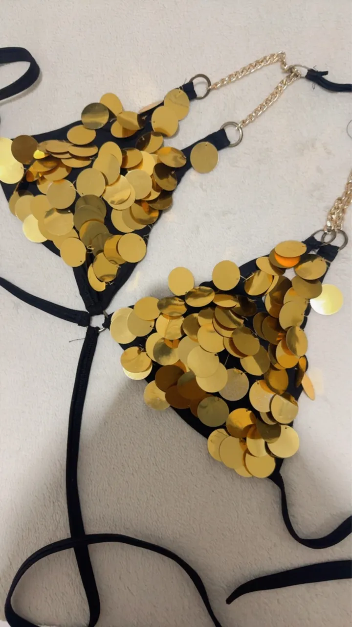 Top cropped deslumbrante, perfeito para um visual cheio de brilho e estilo. Detalhes em paetês dourados que capturam a luz, ideal para festas e eventos especiais. Conforto e elegância em uma só peça!