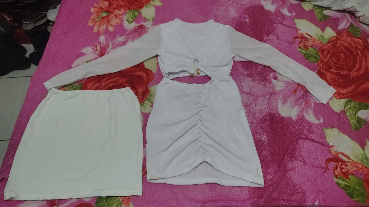 Vestido branco tamanho único, estica e acompanha nagua, é transparente nós braços, possui detalhe a baixo dos ceios,plinçado entre as pernas e gola alta bem confortável, usado uma vez