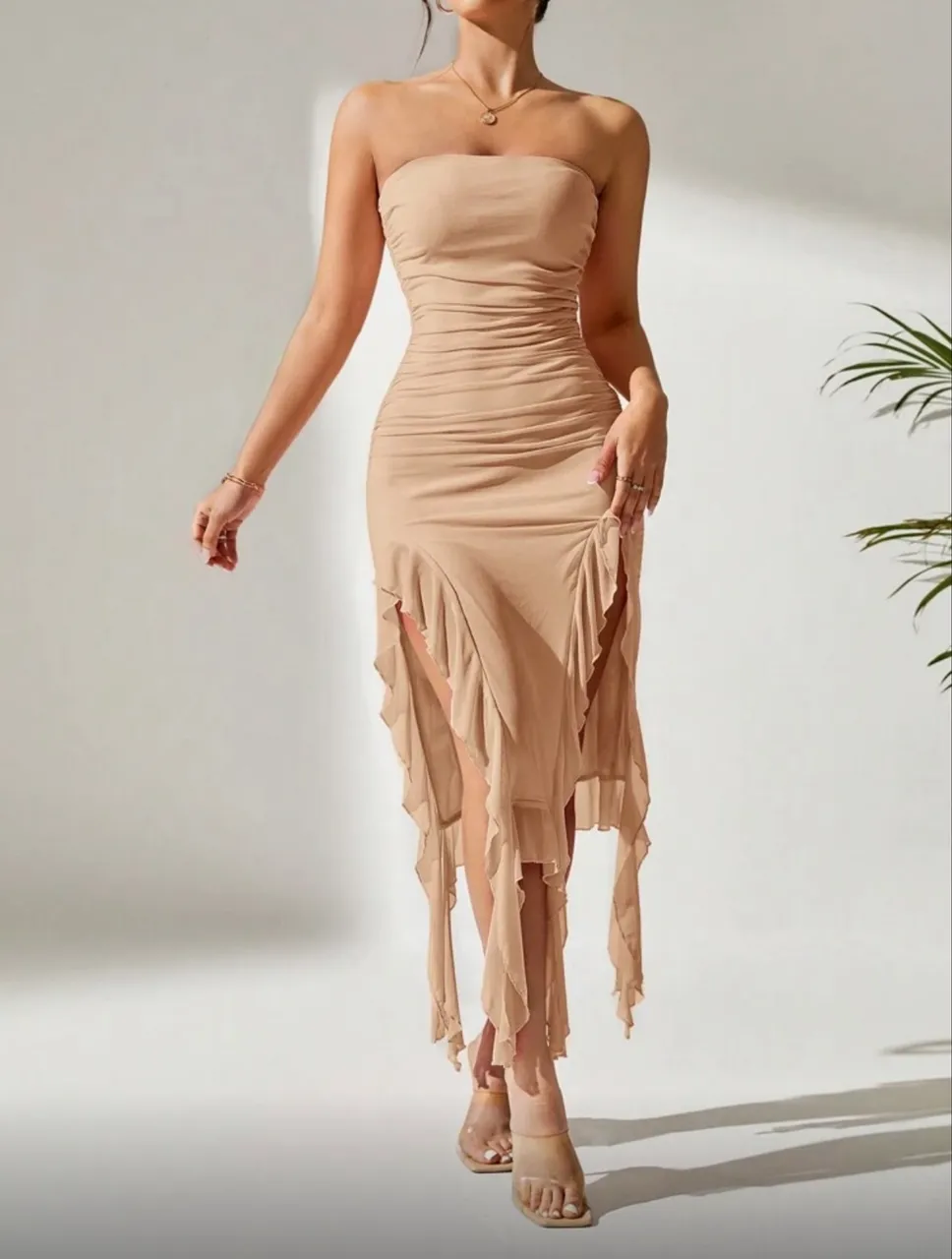 Lindo vestido tomara que caia cor caqui, com detalhes drapeados e fenda lateral com babados, tamanho XP. Usei apenas uma vez, está bem conservada, o motivo de não ter usado mais foi por que acabei ganhando peso e não coube mais.