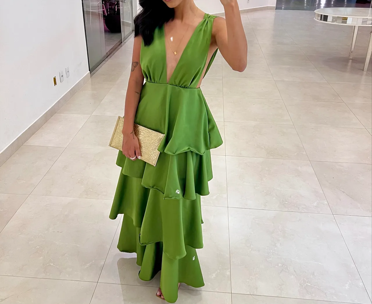 Deslumbre com este elegante vestido de festa! Perfeito para ocasiões especiais, este vestido verde vibrante certamente chamará a atenção. Seu design sofisticado e detalhes únicos garantem um visual marcante.