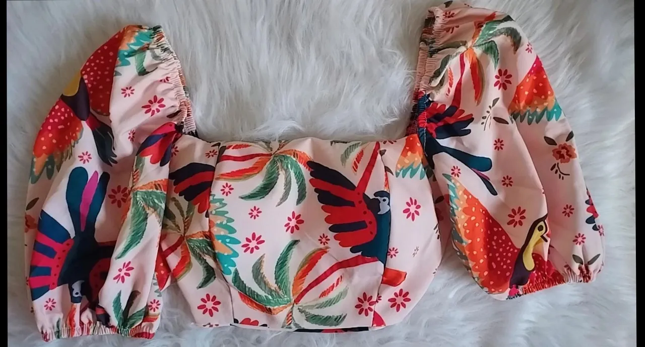 Lindo cropped com estampa vibrante de pássaros e folhagens tropicais. Perfeito para um look cheio de estilo e personalidade! Vestidos e muitos mais