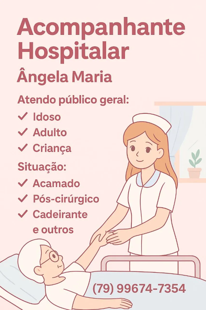 Olá, meu nome é Ângela Maria. Estou cursando Enfermagem (7º período), possuo experiência como acompanhante hospitalar e tenho dedicação em oferecer cuidado humanizado e responsável. Estou sempre em busca de aprimorar meus conhecimentos para prestar um atendimento de qualidade.