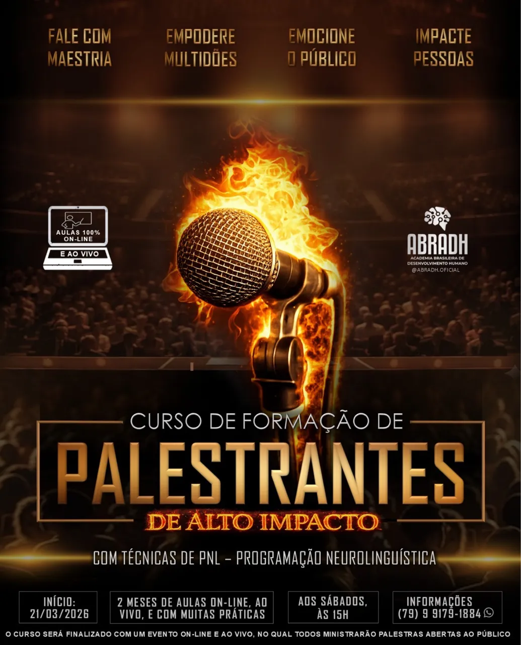 Se você deseja falar com maestria, empoderar multidões, emocionar o público e impactar pessoas, este curso foi desenvolvido para formar palestrantes preparados para subir ao palco com segurança, autoridade e presença.