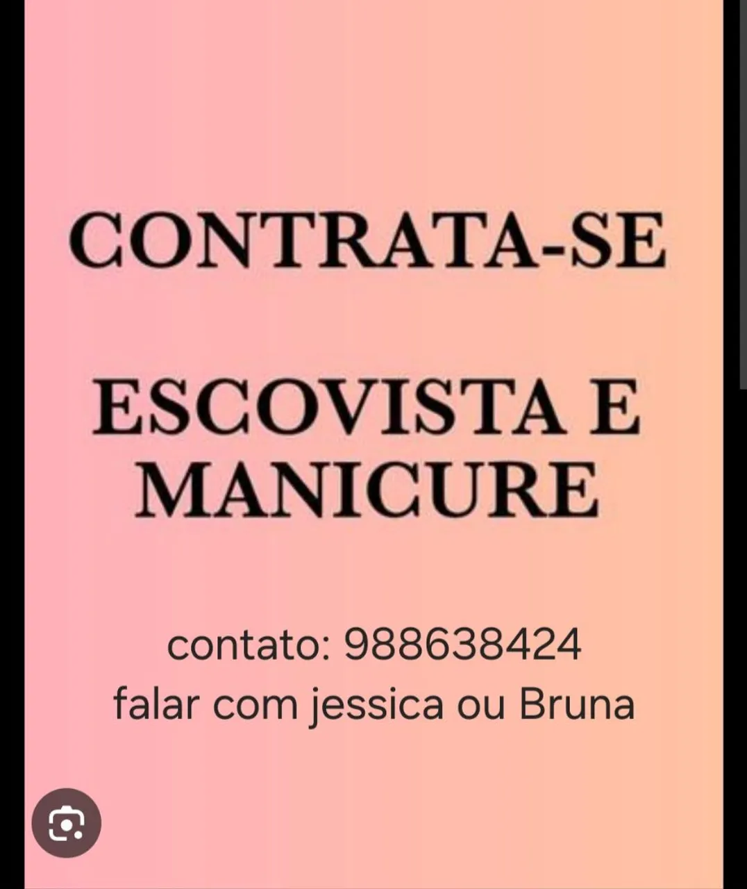 Estamos contratando manicure e escovista para trabalhar sexta e sábado Salão de beleza na coroa do meio. Contato :