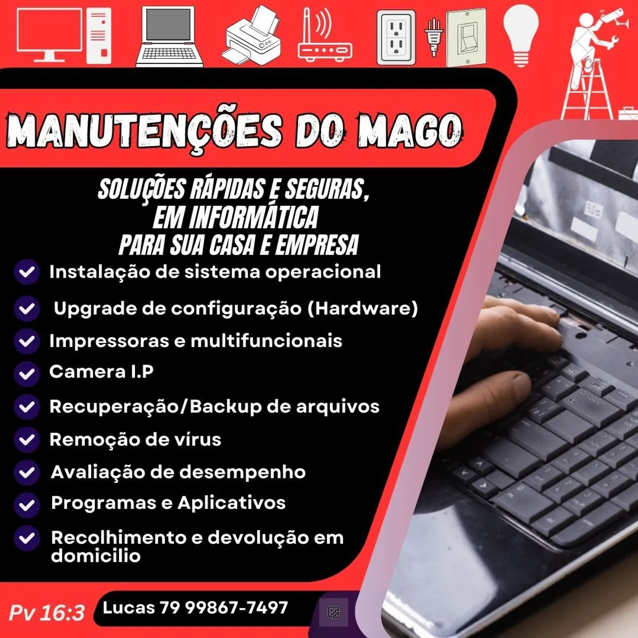 Trabalho com limpeza preventiva. Teste de funcionamento. Conserto e diagnóstico de problemas. Upgrade de CPU. Sistema de ventilação.