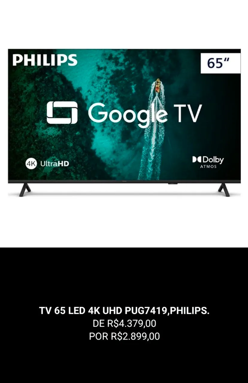 Desfrute de imagens incríveis com a TV LED 4K UHD PUG7419 da Philips! Com 65 polegadas, Google TV e tecnologia Dolby Atmos, esta TV oferece uma experiência cinematográfica completa no conforto da sua casa. Imagens nítidas e som imersivo para você aproveitar seus filmes e séries favoritos!